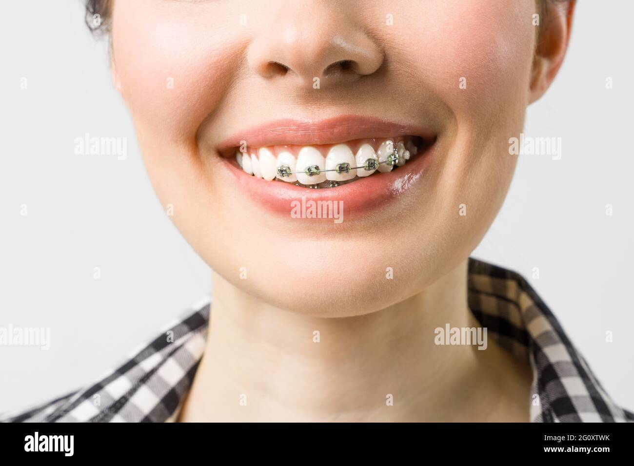 Orthodontic Treatment Dental Care Concept Beautiful Woman Healthy Smile Close Up Closeup Ceramic And Metal Brackets On Teeth Beautiful Female Stock Photo Alamy